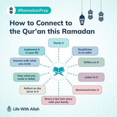 It has been said that whilst the primary purpose of fasting is to gain taqwā, the purpose of Ramaḍān is to connect with the Qur’ān. Indeed, Ramaḍān is the month of the Qur’ān. We know from the authentic Sunnah that every Ramaḍān, in the best month of the year, the best of mankind, the Messenger of Allah ﷺ would revise the Qur’ān, the best of words, with the best of angels, Jibrīl (‘alayhis salām). Here are 10 practical ways you can connect to the Qur’ān in this blessed month: 1. Recite as much Qur’ān as you can. Try to complete at least one khatmah/khatam of the Qur’ān. However, if you managed to complete one last year, aim to increase your khatmah by one and complete two this year. This may seem ambitious, but make du‘ā’ to Allah (subḥānahū wa ta‘ālā) to help you accomplish this as du‘ā’ makes the impossible possible. The charts here are an excellent guide to help you to plan your daily recitation in order to achieve your goals. 2. Read the tafsīr of a chosen sūrah. Pick a sūrah or a collection of sūrahs, and then read or listen to the tafsīr (explanation) of these sūrahs. Focus on them in this month. English translations of tafsīr works, some of which are available online include: Tafsīr al-Jalālayn, Tafsīr Ibn Kathīr, Ma‘āriful-Qur’ān, In the Shade of the Qur‘ān, and Tafsīr al-Sa‘dī. 3. Ponder and reflect on the Qur’ān (tadabbur). Recitation of the Qur’ān is not enough. Allah (subḥānahū wa ta‘ālā) tells us: “This is a blessed Book which We revealed to you, that they may reflect upon its verses, and those with understanding may take heed.” (38:29) Reflecting upon the Qur’ān entails thinking over the meaning and the purpose behind an āyah: what is Allah (subḥānahū wa ta‘ālā) asking me to do here? Deep thinking and reflection allow us to develop a deeper connection with the Qur’ān and will catalyse us to act upon the Qur’ān inshā’Allah. Suggestion: Qur’ān Journaling (i.e. jotting down thoughts and reflections) may be a useful means for staying consistent with tadabbur. 4. Listen to the Qur’ān. Although there is more reward in reciting the Qur’ān, listen to it when you are not able to recite it. The benefits of listening to the Qur’ān are (though not limited to): improving your tajwīd, aiding your memorisation and providing you with the chance to absorb the beauty of the Qur’ān. Here are a collection of long and short recitation clips which you may listen to. Suggestion: download your favourite clips to avoid the inescapable YouTube adverts or alternatively, use an ad-free Qur’ān app. 5. Choose a story from the Qur’ān and share it with your families and friends. The Qur’ān is full of stories which are filled with deep wisdom. Choose a story from the Qur’ān which inspires you and share this story with your families, friends and children. From the talking ant to the golden cow; from the baby which spoke to the snake which turned into a stick; make the Qur’ān a part of your families’ lives. 6. Select 30 du‘ās from the Qur’ān and focus on one each day. Select one Qur‘ānic du‘ā’ for each day of the month and repeat this du‘ā’ throughout the entire day. Choose as many moments as possible from the special times in which du‘ā’ is accepted to make this du‘ā’. Suggestion: reflect on the background of each du‘ā’ and learn the translation of the du‘ā’. 7. Memorise as much as you can. Fix an amount to memorise every day. Even if you do two lines a day, with consistency you will have memorised 60 lines by the end of the month inshā’Allāh. Just imagine that you are in the hereafter and you are being told: “Read, ascend, and recite slowly and distinctly as you used to recite in the world…” (Abū Dāwūd) and depending on how much you’ve memorised, that is where you will have to stop. The more you’ve memorised, the higher you will be able to go. Aim high this Ramaḍān! 8. Interact with what you recite. In your night prayers, interact with the āyāt you are reciting like the Messenger of Allah ﷺ did. When you come across an ayah of mercy, stop and supplicate to Allah. When you come across an āyah of punishment, stop and ask for Allah’s protection. 9. Vary what you read in Ṣalāh. Rather than sticking to what you always read, try to vary between the different sūrahs you have memorized. This will help you to perform Ṣalāh with more khushū’ (humility and concentration) and you will start to feel the sweetness of Ṣalāh. 10. Implement the Qur’ān in your life. Allah (subḥānahū wa ta‘ālā) has described specific qualities that we should embody as believers: these are the People of the Qur’ān. To help you become such people of the Qur’ān, who are the chosen people of Allah, here is a selected list of Qur’ānic qualities. a) Select one of the qualities from the list and make it your focus for this month. b) Reflect on the related āyāt (which are in the pdf document). c) Work on developing the quality consistently throughout Ramaḍān, so that it becomes a part of you and lives on in you beyond Ramaḍān. Suggestion: write down this quality on a piece of paper and stick it on your fridge or somewhere where you are likely to see it every day to remind yourself. May Allāh make us from the People of the Qur’ān. Source