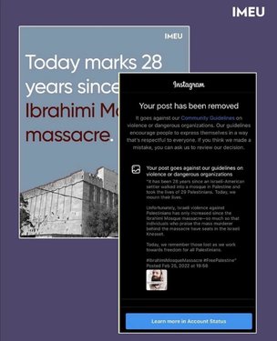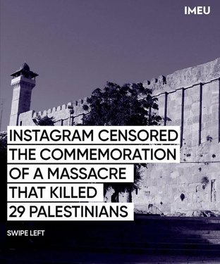 On the 28th anniversary of the Ibrahimi Mosque Massacre—during which an Israeli-American settler named Baruch Goldstein opened fire on Palestinians inside a mosque, taking 29 Palestinian lives and injuring 150 more—the IMEU published a post on Instagram in remembrance of the Palestinians killed that day. Soon after, we were notified that Instagram took the post down.Facebook and Instagram have a history of censoring and silencing Palestinian stories, particularly those describing Palestinian suffering at the hands of Israeli violence. A 2021 Human Rights Watch report found that Facebook “wrongfully removed and suppressed content by Palestinians and their supporters, including about human rights abuses carried out in Israel and Palestine during the May 2021 hostilities.” Juve Muhammad (@juveyildiz) • Instagram photos and videos