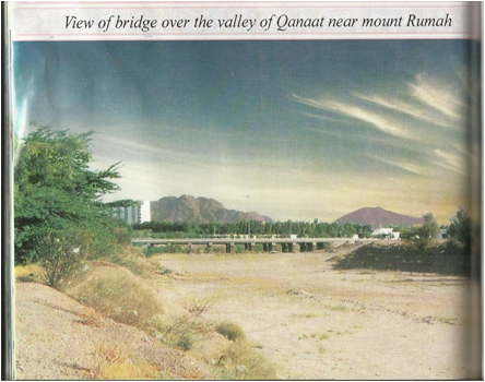 Valley of Qanaat وادى قنات This valley runs from Taif through to Aaqool near Madinah and then enters Madinah from the north-eastern district and passes near Mount Rumah and flows towards Ghabah (Khulail) where it meets its end. It is also known as "Waadi Shazah". The tribe of Banu Haarithah and Banu Abdal Ash'hal populated its southern banks just east of the plains of Uhud. Waadi Qanaat passed on both sides of Mount Rumah in such a way that Mount Rumah was in the middle of this valley. The graves of Hamzah (RA), his foster brother Abdullah bin Jahsh (RA) and Mus'ab bin Umaiar (RA) were on the northern bank of this valley. In the period of Muawiyyah (RA) the water level of the water rose and its flow became fierce. This posed a danger to the graves. The blessed bodies of these martyrs were exhumed and reburied at a safer spot, now within the enclosure of the cemetery of the martyrs . The northern meander of this valley, which passed north of Mount Rumah was present up to recently. In view of further distancing the graves from the valley and to widen the plain between Mount Rumah and the cemetery to further accommodate visitors, the Saudi Govenment filled and blocked the northern meander only leaving the southern meander open. "Pictorial History of Madinah Munawwarah" by Dr. Muhammad Ilyas Abdul Ghani