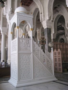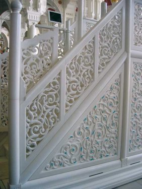 The Minbar of Masjid al-Haram Until 1978 a traditional Minbar built from white marble, originating from the Ottoman period, was placed near the eastern corner of the Kaaba. As it was too big an obstacle for the increasing number of pilgrims, it had to be removed like other constructions from the courtyard of the Masjid al-Haram. Subsequently a smaller, wooden Minbar was used as a mobile pulpit for the rendition of the weekly Friday sermon. In 2001 SL Rasch was assigned a contract for the design and manufacturing of a new Minbar. The challenge was to build it from marble, more than five meters high, but nevertheless mobile and to complete this complex structure in less than one year to be used in Ramadan 1423. The body, made of white marble and partially reinforced by glass-fiber laminate, is carried on a stainless steel frame by a battery-driven steerable chassis. The Minbar in the Mataaf -October 2013 The side panels and railings, richly decorated with floral ornaments and turquoise stones in gilded bezels, were carved by traditional masters in Rajasthan, India, on the basis of drawings provided by SL Rasch. To save weight, some structural elements of the cladding such as the dome and its base profile are made of Corian®. The space below the landing houses an airc onditioning system which provides cold air for the imam at his elevated seating. An adjustable support holds microphones for the transmission of the sermon, and a screen, allowing the reading of a stored text. Dimensions: 3,2 x 1,8 m, height 5,9 m Weight: 5,5 t Materials: Stainless steel frame; marble cladding with inlaid turquoise stones; glass-fiber reinforced epoxylaminate for inner dome; Corian® for the dome base and exterior. Completion: 2002 Source
