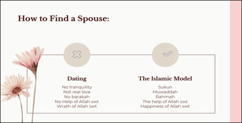 Before Nikah True love is in Nikah Nabi sallallaahu 'alayhi wasallam said, “There is nothing like marriage, for two who love one another” (Ibn Majah) This hadith teaches us that there is nothing that creates true and lasting love between two people of the opposite gender, except Nikah. Love outside Nikah will not last in the world and will be a source of anguish in the world and in the Aakhirah. Potential spouses seeing each other Islam commands us to lower our gaze and forbids looking at non-mahram. This is in order to purify people’s souls and protect their honour. There are, however, certain exceptions in which it is permissible to look at a non-mahram woman for reasons of necessity, one of which is in the case of proposing marriage, because it is the basis on which a very important decision affecting a person’s life will be taken. Imaam al-Nawawi (Rahimahullah) said in Rawdat al-Taalibeen wa ‘Umdat al-Mufteen (7, 19-20): “When (a man) wants to marry (a woman), it is preferable (mustahabb) for him to look at her so that he will have no regrets. According to another view, it is not preferable but it is allowed. The first view is correct because of the ahaadeeth, and it is permitted to look repeatedly, with or without her permission. If it is not easy to look at her, he may send a woman to check her out and describe her to him. A woman may also look at a man if she wants to marry him, for she will like in him what he likes in her. What is permissible for him to look at is the face and hands, front and back. He should not look at anything else.” All four schools of thought recommend looking at the prospective spouse even if there are feelings of sexual desire. There should be a sincere Niyyah for marriage and following the Sunnah and keeping in mind the principles of Deen throughout the occasion. The couple cannot sit in Khalwah. If necessary than the door of the room the couple sit should be left open. There should be no touching or revealing of Awrah. She should dress normally and not be dressed up. In the following Hadith the Prophet sallallaahu ‘alayhi wasallam told the Sahabi RA to go and look at the woman as “It is more likely to create love between both of you”. This indicates the importance of internal and external attraction and external attraction is critical in maintaining a relationship between spouses. The eyes are conduits to the heart and as we have learnt, there are neurons involved. Therefore, looking at each other can create love though it is dangerous in another context. Other Hadith regarding looking at prospective spouses: From Abu Hurayrah RA: “I was with the Prophet sallallaahu ‘alayhi wasallam when a man came and told him that he had married a woman of the Ansaar. The Messenger of Allah sallallaahu ‘alayhi wasallam said to him, ‘Have you seen her?’ He said, ‘No.’ He said, ‘Go and look at her, for there is something in the eyes of the Ansaar.” [Muslim] This teaches us that to inform someone of a person’s defect in the process of marriage is not backbiting. From Jaabir ibn ‘Abd-Allah RA: “The Messenger of Allah sallallaahu ‘alayhi wasallam said: ‘If one of you proposes marriage to a woman, if he can look at her to see that which will encourage him to go ahead and marry her, then let him do so.’ I proposed marriage to a young woman, and I used to hide where I could see her, until I saw that which encouraged me to go ahead and marry her, so I did so.’” [Abu Dawood] Looking secretly does not mean looking through a window while the woman may not be dressed appropriately. It refers to looking at her without letting her know when she is outdoors in regular clothing to see how she behaves and interacts. There should be no unnecessary delaying as the Prophet sallallaahu ‘alayhi wasallam said, “If someone approaches you (with a proposal) and his religion (piety) and character is pleasing to you, then get him married. If you do not do so, there will be trials (fitnah) and chaos (fasad) on the earth…” [Tirmidhi] This slide shows the different outcome of following the Islamic model and dating when looking for a spouse. In our age there is so much more than previous times; confusion about person’s gender, premarital cohabitation, children through Zinaa, and improper use of technology and social media. Nowadays the question, “How can I marry someone I don’t know” is very common. Wanting to communicate and meet without chaperones to get to know each other is taken very lightly and unfortunately, in these situations, women are often taken advantage of and left with tarnished reputations and broken hearts. The reality is that one can never know anyone through such meetings. Only Allah ta’ala is the knower of the unseen and Barakah, peace, love mercy and His help will come with following the Islamic model of finding a spouse, i.e. to get information about what common goals can be shared, compatibility, etc. through others and thereafter doing Istikharah and relying on Allah ta’ala for guidance instead of having multiple meetings without a chaperone. The Prophet sallallaahu ‘alayhi wasallam said, “No person (man) should be alone with a woman except when there is a Mahram with her” [Bukhari & Muslim] Everyone has issues in relationships and especially in a marriage. Faults will open up later however by that time Allah ta’ala puts love between spouses and both have heavily invested in the relationship and the relationship will be protected. Success therefore comes only in following the Islamic model of finding a spouse. In any situation, following the principles set out in our Deen keeps a person safe. Whether a matchmaking business is used in the search for a spouse or it is arranged by elder family members, one should ensure that the principles of Deen are not compromised. A man or a woman should not send a direct proposal to the future spouse. It should be done through parents or elders. We have the per