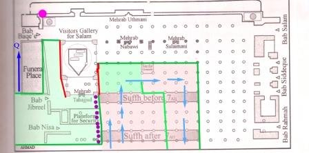 The following is very helpful information from Al-Miskeenah (Click on picture to enlarge) This post is in response to Sister Shahida’s inquiry about the conditions of Ziyarah for sisters when visiting our Blessed Al-Mustafa SallAllahu alaihi wasallam in this Luminous City of Light and Radiance. Information is not only relevant for sisters but also for brothers to understand, as many visit with their female family members who need the basic information on where and when to go. Sisters often arrive at the wrong section assuming they can access the Rowdha Shareef from there, or some arrive towards the end of visiting times and are prevented from entering. In some cases some miss visiting altogether due to not knowing the routine. Also, the conditions vary according to the time of the year, between the few months when there are no Umrah visa issued, the low and the peak Umrah seasons culminating in Ramadhan and Hajj. There are only two prayer areas for sisters; the north western corner (orange line) accessed through doors 13-15, and the north eastern corner (pink line) through doors 25-28. In both sections the areas on the Qiblah side of the light blue lines are for sisters without children with a barrier separating the area for sisters with children. Security sisters are positioned at the openings of this barrier ensuring this rule is abided by. However during the busy times of Hajj and Ramadhan this division usually does not apply as the number of children at these times is far less. Access to Rowdha Shareef for sisters is ONLY through the eastern section, by following the blue path. The sisters prayer area is separated from the men’s area by a tall finely decorated “mashrabiyah”, the traditional wooden Arabic screen, which allows air to still circulate, but limits visibility either way. The purple dotted line indicates where the huge doorways are for gaining entrance to the Rowdha Shareef. These are only opened during the Ziyarah times for sisters. The main session being after Ishraq until approximately 10.30am, but it is advisable to arrive by 10am the latest as the entry doors will be shut, even though sisters will still be inside the visiting area. During the crowded seasons it is best to remain in the Masjid from after Fajr Salat making your way to as near to the mashrabiyah (purple dots) as possible. The wait may be an hour or so as brothers need to be vacated from the area allocated for sisters and the white canvas fence to be erected. This demarcates the pathway to be followed to reach the visiting area and the greater men’s section of the Masjid, brothers are still able to access the Masjid and cross the sisters’ pathway during their visiting times. The actual position of this barrier tends to change, especially in and immediately around the Rowdha Shareef area, maybe according to the numbers, maybe trying various configurations, as the whole arrangement is far from satisfactory. The second time for sisters’ ziyarah is after Salatul Zuhur. This session is only very short compared to the morning session so once again wait at the mashrabiyah soon after Salat has finished. During peak times they have tried to implement a one way system….the lime green line represents the exit pathway, which is a separate fenced area. Many do not realize this and leave their shoes in shelves on their way into the Rowdha Shareef, and then find they have to walk all the way back to the main sisters area to enter the way in again. Shoes and bags can be a hindrance in the crowds, and yet leaving them somewhere also can cause distress in locating them again, and the issue of “lost” shoes has also become rife! I always recommend you come with a shoe bag….one that has a strap that is across the chest so your hands are free. The other “feature” employed when the crowds are great is the marshalling into groups according to nationality. Various “security” guards are given placards on sticks with the name of the main different countries on them…they stand in certain places on a chair waving these placards for the sisters to assemble around them. They are given a lecture on the Adab of Ziarah and can be “held” in these holding areas for ages. I have seen physical fights with this arrangement, and there are many cases of broken bones and sisters taken to hospital! Another aspect of trying to organize the crowds is the use of megaphones! Yes….megaphones in the Masjid, as well as under the umbrella area, so close to our Beloved Rasulullah SallAllahu alaihi wasallam! And then there is the moving canvas tactic! Two “security” guard sisters hold a piece of canvas about one meter wide and five long…they “wrap” this around a group of sisters….and “pull” them into place! And during Ramadhan and Hajj , this holding place is literally a fenced in area positioned in front of one of the doors of the mashrabiyah. Once it is full it is shut. Sisters have to wait in these pens until space is made available under the umbrella area. If all this sounds like a disgrace it is because it is! It is a shambles. The emotions are high. Thousands of sisters have come to pay their respects, to give their Salam, some having waited decades for this opportunity. Many just sit and cry, Many are too weak or incapacitated to sustain this treatment. Hundreds resign themselves to never making it to the Rowdha area and convey their Salam from the back of the Masjid, or from the other sisters prayer area where it is calm and quiet. (Click on picture to enlarge) This is a detail of the visiting area. The smaller green section is the green carpet area of Rowdha Shareef available for the sisters. The darker green lines represent the fence that is erected prior to our visiting times. The blue arrows indicate the direction one is to follow, the central green line is the fence separating the going in area to the exit area. It is almost impossible to offer two Raka’ts now, the crowds being too dense, a