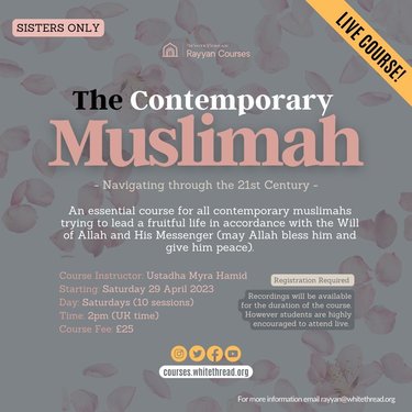 "The Contemporary Muslimah" is a short course designed to enable Muslim women to think deeply about and make critical decisions regarding their identity and how they conduct themselves in the world today. By unpacking ideas often taken for granted, it will invite participants to question their assumptions and their priorities, forcing them out of their comfort zones. The course covers a wide array of topics including mental and emotional health, feminism, women's leadership, the fiqh of dressing and beautification and the etiquettes of male-female interaction in various settings. It addresses common critiques on Islam's position on issues related to women such as polygamy, and clarifies the Islamic perspective on contentious contemporary issues like homosexuality and transgenderism. By putting into perspective the purpose of our existence and shedding light on how this purpose is to be achieved, it promises to go beyond being merely informative to being a truly transformative experience. This comprehensive course is a necessary anchor for Muslim women navigating the choppy waters of internal conflicts and the chaotic world they find themselves in today. It grapples with modern and post-modern realities while deeply rooted in the sacred knowledge tradition. A must for all contemporary muslimahs trying to lead a fruitful life in accordance with the Will of Allah and His Messenger (may Allah bless him and give him peace). The Contemporary Muslimah (whitethread.org)