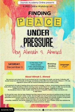 Finding Peace under Pressure workshop - 5th December 2015 Zaynab Academy Online Speaker: Alimah S. Ahmed Write-up: ummi taalib This excellent workshop was on how to deal with pressures living in a modern world where pressures have increased many fold compared to the past, especially for women who are faced with pressures of the home as a wife and mother along with educational, career and peer pressures (which does not only affect teenagers but adults as well in universities, professions etc.). Modern day psychologists and psychological studies show many ways of dealing with these pressures. Alimah S. Ahmed has taken five points and intertwined them with the Islamic perspective. Alhamdulillah, it was very beneficial as a solution and hope for those women seeking peace under pressure as well as showing us that the Noble Qur'an and the teachings of our beloved Nabi Muhammad sallallaahu 'alayhi wasallam provided these very solutions more than 1400 years ago! InshaAllah these notes become beneficial for many even though I truly cannot do justice to the talk. So firstly what is Pressure & Stress? Pressure is external conditions which makes us feel that we have to do certain things or behave in a certain manner, meet certain deadlines or fulfil certain obligations or expectations from people or even expectations from one's self i.e. a goal or a desire. There are different levels of pressures which depend on situations, backgrounds, culture etc. These pressures lead to stress which is the internal reaction. People may experience the same pressures yet react differently with some dealing with the situation calmly while others may feel the stress, some to a much higher degree than others. Stress is something everyone experiences. Allah ta'ala mentions in the Qur'an that a human being cannot get except for what he strives for. وَأَنْ لَيْسَ لِلْإِنْسَانِ إِلَّا مَا سَعَىٰ "And that man hath only that for which he maketh effort" [53:39] A healthy level of stress is necessary to get ahead in life, be it in one's Deen (Religion) or Dunya (Worldly matters). It makes a person work harder. The problem comes with unhealthy levels of stress which leads to psychological problems such as anxiety, depression and even mental breakdowns. For some people stress leads to physical problems such as backache, shoulder pains and tense muscles. Stress can also affect our spiritual self like our connection with Allah ta'ala, our Imaan, our tawakkul in Him etc. Finding "Peace under Pressure" is attaining this spiritual peace. The psychologists and councillors will show us various methods to de-stress however the real peace comes when one finds this connection with Allah ta'ala, one's God, one's Creator. Due to not having this understanding many people try to find ways of relieving stress through harmful ways such as drugs, drinking, fun and futile activities or releasing stress and harming those below them. For instance a head teacher may have stress and release it on the teachers who in turn release it on the students, or a woman is under pressure from her husband or boss and may not say anything to them however takes it out on her children, which is dangerous. In the long run these methods do not change the situation nor do they release the stress. The stress needs to be released in a healthy way similar to eating healthy food instead of junk food eaten to fill the hunger when food is not ready. This is not proper nourishment. Similarly unhealthy methods of releasing stress are counterproductive. Finding real peace makes us more productive and better people.