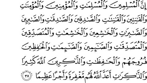 Qualities of True Believers, Male & Female, in the Noble Qur’an Surat Al-‘Ahzab [33:35] Lo! men who surrender unto Allah, and women who surrender, and men who believe and women who believe, and men who obey and women who obey, and men who speak the truth and women who speak the truth, and men who persevere (in righteousness) and women who persevere, and men who are humble and women who are humble, and men who give alms and women who give alms, and men who fast and women who fast, and men who guard their modesty and women who guard (their modesty), and men who remember Allah much and women who remember - Allah hath prepared for them forgiveness and a vast reward.