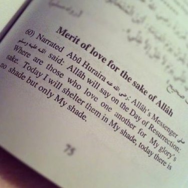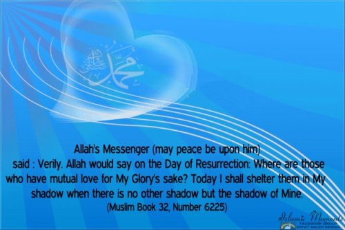 Love for the sake of Allah Abu Hurayra reported that the Messenger of Allah, may Allah bless him and grant him peace, said, "Allah Almighty will say on the Day of Rising, 'Where are those who loved one another for the sake of My majesty? Today, on the day when there is no shade but My shade, I will shade them.'" [Muslim] Abu Hurayra reported that the Prophet, may Allah bless him and grant him peace, said, "A man visited a brother of his in another village and Allah positioned an angel to wait for him on his way." He mentioned the hadith to his words, "Allah loves you just as you love him for His sake." [Muslim] Mu'adh said, "I heard the Messenger of Allah, may Allah bless him and grant him peace, say, 'Allah, the Mighty and Exalted, says, "Those who love one another for My majesty will have minbars of lights. The Prophets and martyrs will envy them."'" [at-Tirmidhi] Hadith Collection from Sunnipath