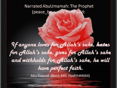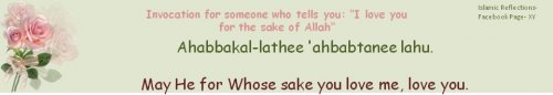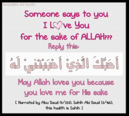 I Love you for the sake of Allah Abu Karima al-Miqdad ibn Ma'dikarib reported that the Prophet, may Allah bless him and grant him peace, said, "If a man loves his brother, he should tell him that he loves him." [Abu Dawud and at-Tirmidhi] Anas bin Malik (May Allah be pleased with him) reported: A man was with the Prophet (sallallaahu ’alayhi wa sallam) when another man passed by and the former said: "O Messenger of Allah! I love this man (for Allah's sake)". Messenger of Allah (sallallaahu ’alayhi wa sallam) asked, "Have you informed him?'' He said, "No". Messenger of Allah (sallallaahu ’alayhi wa sallam) then said, "Tell him (that you love him)". So he went up to the man and said to him, "I love you for the sake of Allah;'' and the other replied, "May Allah, for Whose sake you love me, love you.'' [Abu Dawud].
