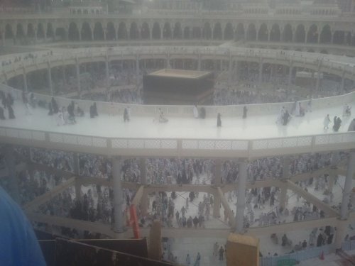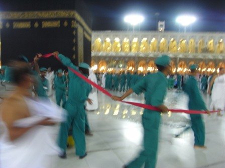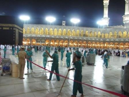 Haram Cleaners in Action SubhanAllah, the area that Masjid al-Haram occupies on the earth must be the cleanest patch of land on the entire globe. Armies of diligent cleaners, brothers and sisters, are dusting, polishing, mopping, sweeping, vacuuming, washing and picking up all that is dropped 24/7. The efficient routine never ceases, and the care and love seen on all contibuting to this task is admirable. Their presence is evident in every direction one gazes; high above scaffolding meticulously cleaning each and every architectural feature and light fittings to all surfaces below. The antics of the brothers in the turquoise uniforms as they are engaged in the major cleaning mesmerize. Children laugh excitedly, adults stare in amazement as if watching a skillfully choreographed ballet. The display of dexterity and nimbleness as they contol all the props is a performance of agility and devotion, and a mastery of organization. ALMISKEENAH