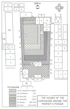 Details of the Doors of Masjid Nabawi Click on picture to enlarge to see the position of the doors - marked D1, D2 etc. Omar bin Abdul Aziz (RU) installed twenty doors during the extension of the Prophet’s Mosque in 91 Hijrah. Eight of these doors were in the eastern wall. Similarly eight doors were in western wall of the Mosque. Remaining four doors were in the northern wall of the mosque. When Caliph Mehdi Abbasi further extended the Mosque in 165 Hijrah, he did not install any additional door. However, the location of these doors was somewhat changed as needed. Many historians have described the surrounding of the Mosque with reference to these twenty doors of Mehdi extension. Most of these doors assumed their names from the names of the companions or other persons whose homes happened to be situated near that door. Hence these doors were very helpful for the earlier scholars in searching for the location of various houses around the Mosque. It will, therefore, be very appropriate to describe these twenty doors one by one to make ourselves familiar with them. Eastern Doors Door No.1: It was called Bab-un-Nabi. This name does not mean that Prophet Mohammad (SAS) used to enter and leave his home through this door. In fact this door did not exist at the time of the Prophet (SAS). This door, however, assumed above name since it happened to be opposite to the Hujrah of Aisha (RUA). This door was closed during a later extension and a window was installed at its location. This window still exists in the eastern wall of the mosque and has the following writing on top of it. Al-Ahzab # 56 Allah sends His Graces on the Prophet (SAS) and also His Angels ask Allah to bless him. O you who believe! Send your Salat on him (ask Allah to bless him) and greet him with the Islamic way of greeting. Door No. 2: It was called Bab Ali since it was located opposite to Ali’s (RU) Hujrah. This door was also closed during a later extension and a window was also installed at its location. This window can be seen in the eastern wall of the present mosque. These two windows are between Bab Jibreel and Bab Baqee. Door No. 3: It was called Bab Jibreel and it does exist even now. Door No. 4: It was called Bab-un-Nisa and it does exist even now. Door No. 5: This was opposite to the house of Asma bint Hussain bin Abdullah bin Obaidullah bin Abbas (RU). Door No. 6: This door was opposite to the house of Khalid bin Waleed (RU). The following wording was written inside this door This extension is made by the order of Caliph Mohammad Mehdi Abbasi and was carried out by the workers of Basra during 162 H. This is where the Mehdi extension starts. (History of Madina by Ibn Shubba and Vafa-ul-Vafa) Door No. 7: This door was opposite to the route leading to open space used for toilet needs by women of Madina. Door No. 8: This door was opposite to the houses built on donated land. This was the last door in the eastern wall. Northern Doors Door No. 9: It was opposite to the house of Hameed bin Abudur Rehman bin Auf (RU). Door No. 10: It was opposite to the house of Abu Algais bin Mugheera. Door No. 11,12: Both these doors were opposite to the Hujrah of Caliph’s freed slave Khalisa. Western Doors Door No. 13: This was opposite to the house of Abdullah (RU) son of Jaafar bin Abi Talib. Door No. 14: It was opposite to house of Munira. Door No. 15: It was opposite to the house of Sakina bint Husain (RUA). Door No. 16: It was opposite to the house of Hassan bin Thabit (RU) who was a famous poet at the time of the Prophet (SAS). Door No. 17: It was called Bab Rahmat and it does still exist. Door No. 18: This was between Bab Abu Bakr (RU) and Bab Rahmat and was on the site of Bab Ziyad. Door No. 19: It was known as Bab Abu Bakr and it does still exist. Door No. 20: It was called Bab-us- Salam and it does still exist. Dr Imtiaz Ahmed