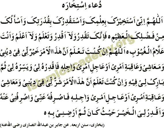 ummtaalib Posted August 6, 2014 Author Report Share Posted August 6, 2014 Istikhara Du'a (Click on picture to enlarge) WAY TO PERFORM ISTIKHARA: First pray Two Cycles (raka') of ritual Prayer (nafil). After finishing prayer recite this (supplication/dua') above. TRANSLATION: "O Allah! I seek goodness from Your Knowledge and with Your Power (and Might) I seek strength, and I ask from You Your Great Blessings, because You have the Power and I do not have the power. You Know everything and I do not know, and You have knowledge of the unseen. Oh Allah! If in Your Knowledge this action ------------------------------------------------ (which I intend to do) is better for my religion and faith, for my life and end [death], for here [in this world] and the hereafter then make it destined for me and make it easy for me and then add blessings [baraka'] in it, for me. O Allah! In Your Knowledge if this action is bad for me, bad for my religion and faith, for my life and end [death], for here [in this world] and the hereafter then turn it away from me and turn me away from it and whatever is better for me, ordain [destine] that for me and then make me satisfied with it." 1 Link to comment Share on other sites More sharing options...